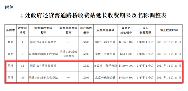 鲁网菏泽5月29日讯(记者 庞洪波)近日,山东省人民政府官网发布关于4处政府还贷普通路桥收费站有关问题的批复,其中菏泽辖区内两处收费站将延长收费期限,分别为国道327菏泽收费站和国道105线单县收费站,延长期限为2年零1个月,收费截止日期均为2021年12月31日。