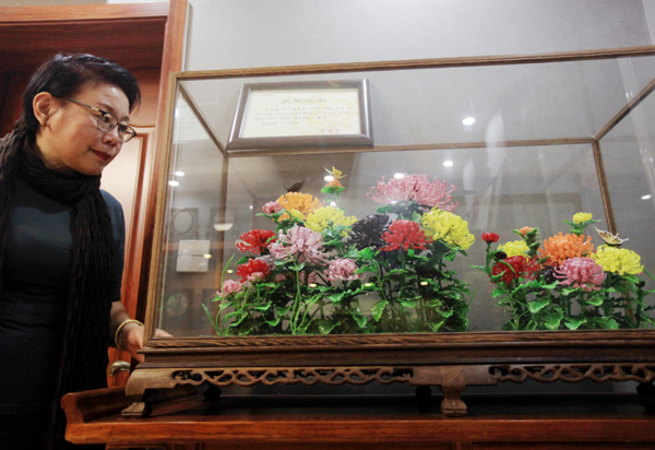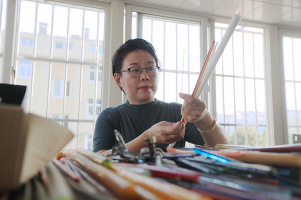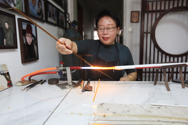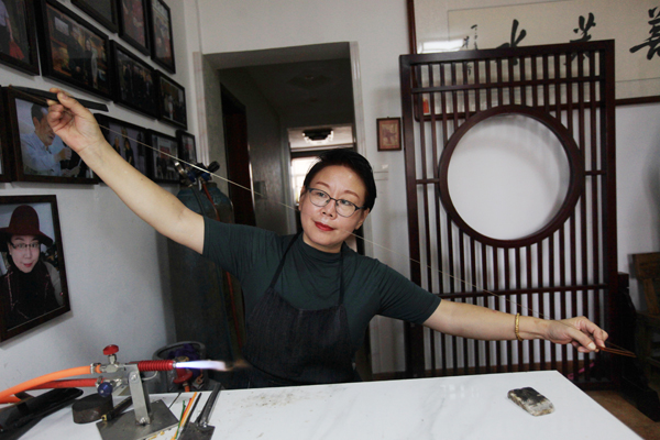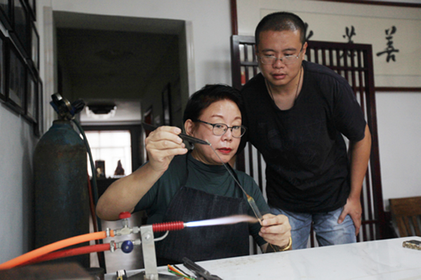 作为琉璃世家的第四代传承人,邹爱云一直在悉心教导儿子如何更好地制作琉璃铺丝