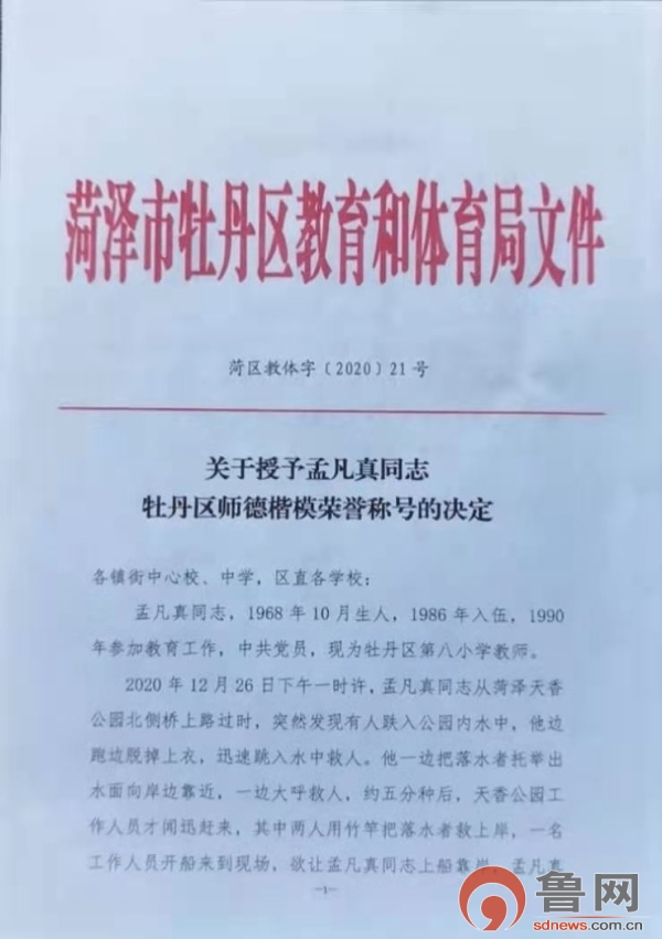 牡丹区教体局《关于授予孟凡真同志牡丹区师德楷模荣誉称号的决定》文件中指出,孟凡真同志舍己救人的行为体现了人民教师对党忠诚、敢于担当、与时俱进的优秀品质和高尚情操,值得学习和发扬。