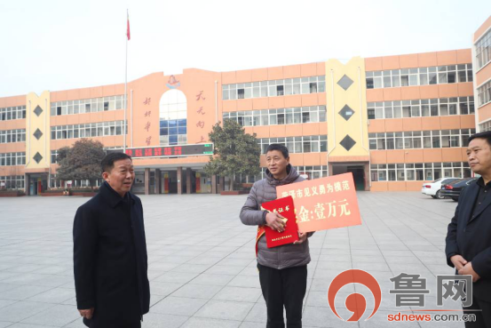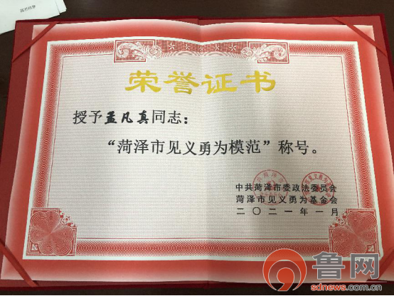菏泽市委政法委、菏泽市见义勇为基金会授予孟凡真“菏泽市见义勇为模范”称号,并于1月20日下午来到了孟凡真所工作的学校,将荣誉证书及1万元奖金交到了孟凡真老师的手中。