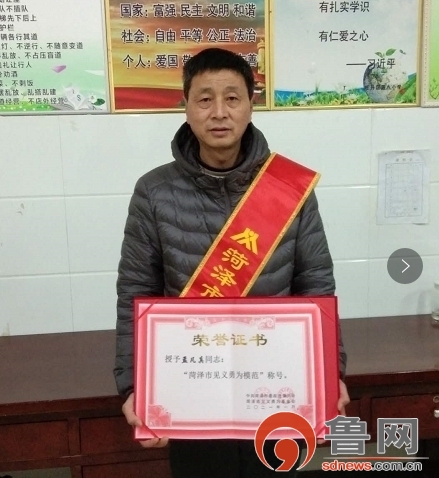 鲁网1月20日讯(记者 范祥海)2020年12月30日,鲁网以《菏泽一老师伤口未愈跳水救人,面对裂开的伤口说:孩子没事,值了!》为题第一时间报道了菏泽牡丹区第八小学的孟凡真老师带伤跳入冰冷的河水中救人致伤口裂开一事,得到了广大网友的点赞转发。1月20日下午,一本“菏泽市见义勇为模范”的荣誉证书送到了孟凡真老师手中。