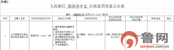 近日,据中国人民银行菏泽市中支行政处罚信息公示表,山东郓城农村商业银行股份有限公司存在以下违法行为:1.提供虚假的金融统计报表;2.违反规定为存款人多头开立银行结算账户;3.超过期限或未向中国人民银行报送账户开立、撤销等资料;4.不当保管假币。中国人民银行菏泽市中心支行对其予以警告,并处20.2万元罚款。