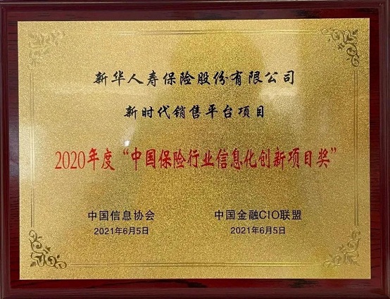 6月,在中国信息协会和中国金融CIO联盟共同主办的2020年度保险信息化技术峰会上,新华保险新时代销售平台APP在中国金融CIO联盟组织的年度优秀成果评选中荣获“2020年度中国保险行业信息化创新项目奖”。