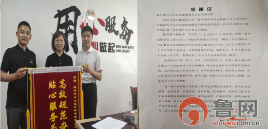 鲁网7月31日讯 7月30日,中南置地临沂城市公司将一面写着“高效规范办实事,贴心服务为企业”的锦旗送到临沂市兰山区审批局项目建设联审联批中心,感谢工作人员在为其办理建筑工程施工许可业务期间提供耐心细致的指导和便捷、优质、高效的服务。