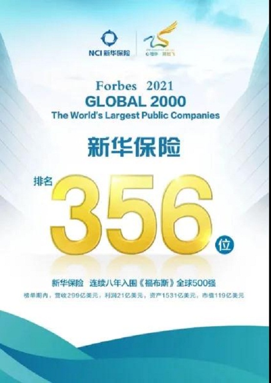5月13日,美国《福布斯》杂志发布2021年度“全球上市公司2000强"榜单。新华保险连续第八年进入榜单前500强,榜单期内,公司营收299亿美元,利润21亿美元,资产1531亿美元,市值119亿美元,居榜单第356位。该榜单排名以营业收入、利润、资产和市值的综合评分为依据,是全球最权威、最受关注的商业企业排行榜之一。