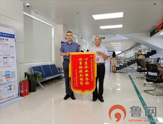 鲁网8月19日讯 8月19日,山东沂蒙大数据科技有限公司负责人赵先生将一面印有“心系企业服务好 办事快捷效能高”字样的锦旗送到临沂市兰山区行政审批服务局新企业开办专区,以此表达对兰山政务优质服务的感谢。