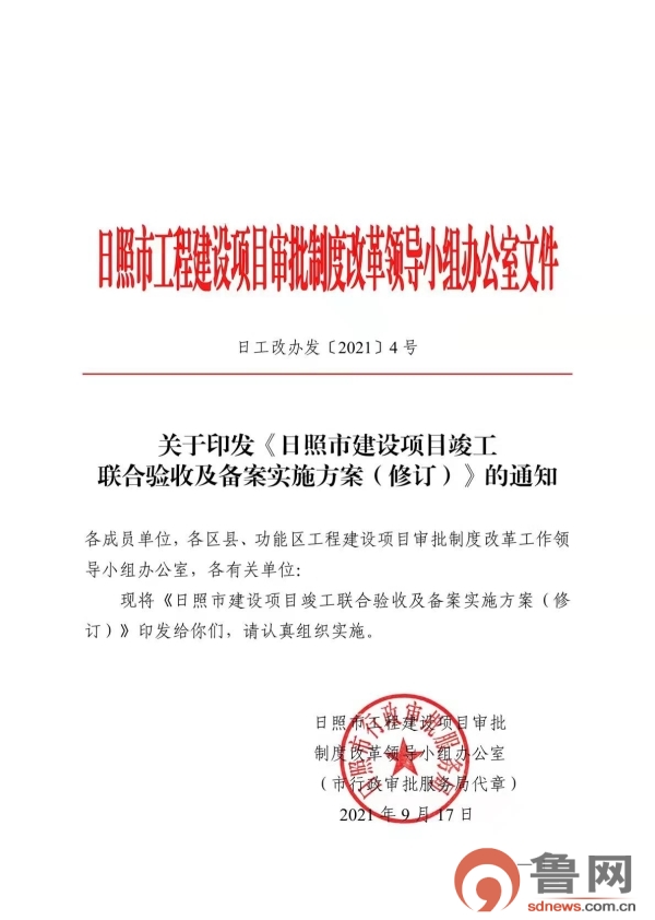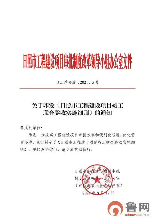 鲁网9月26日讯(记者 董雪)为提高日照市建设项目竣工验收效率,明确竣工验收标准,整合竣工验收阶段专项验收备案事项,9月17日,日照市工程建设项目审批制度改革领导小组办公室印发通知,决定在全市范围内对新建、扩建、改建的房屋建筑工程项目和市政基础设施工程项目实行竣工联合验收工作。