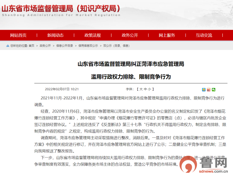 调查期间,菏泽市应急管理局主动采取措施进行整改,消除后果。首先,及时对《菏泽市烟花爆竹连锁经营工作方案》中的相关规定进行修订,并在菏泽市应急管理局官方网站上进行了公示;其次,健全公平竞争审查机制;此外,还向山东省市场监管局报送了整改报告。
