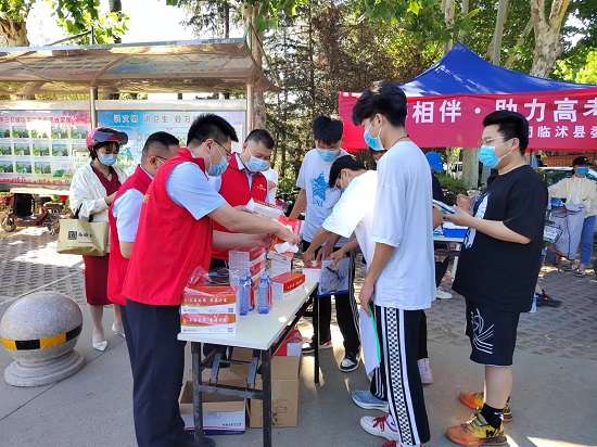 在临沭县第一高级中学、临沭县实验中学等考点,志愿者们向临近考点的考生、家长以及在场维持秩序的公安、交警和环卫工人免费提供矿泉水、面巾纸、湿巾、中性笔、口罩等便民物品和服务,为参加高考的莘莘学子加油助力,为炎炎夏日下的考生及家长送去农商行的祝福。