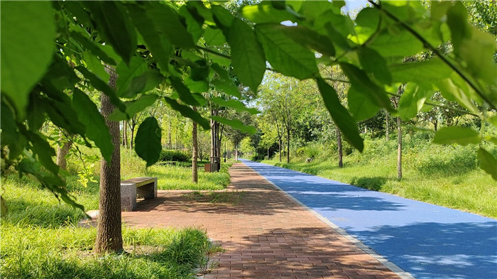清晨时分,济阳区黄河健身公园阳光正好,绿草如茵、树木繁茂,海蓝色的跑道透着生机活力。年轻人带着耳机在跑道上大汗淋漓地跑步健身,周边的老年人带着孩子游玩赏景,让公园充满运动气息的同时,也不失温馨气氛。