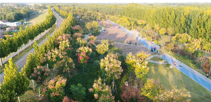 据介绍,济阳区黄河健身公园是在堤顶建设的森林健康绿道体系,设置了羽毛球、篮球、足球等运动场,儿童游乐场,驿站等设施,顺着健身跑道一路直行,不仅可以欣赏到树林花海带来的美景,也可以在运动健身区尽情挥洒汗水,已然成为位于济阳区的“城市外滩”。
