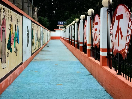 在去往驿站卫生间的路上,有着一段长长的巷子。沙墩驿站也没有让这段墙浪费,而是对墙壁进行了粉刷并做了墙绘,打造出一条郯城特色历史的文化长廊。巷子地面是蓝色背景,期间镶嵌着郯城当地久负盛名的银杏叶。南边的墙壁上则是绘着以孔子师郯为代表的历史文化场景图,北侧的栅栏上则是红色宣传口号。