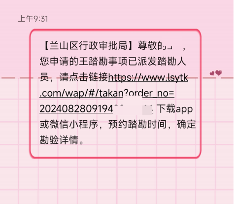 为进一步提升企业群众踏勘服务体验度,兰山区行政审批服务局通过采取无感踏勘方式,将标准、流程及操作指南等已短信形式发送至申请人手机,申请人可根据短信提示自由选择三种方式登录“快勘工作室”。(本网记者)