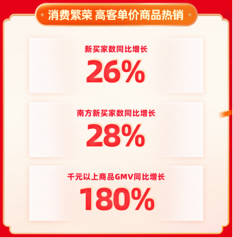 年货节期间,购物团主播送豪礼预约参与人数超380万,新买家数同比增长26%,南方新买家数同比增长28%,千元以上商品GMV同比增长180%。