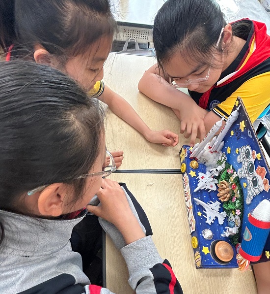 在“致敬航天英雄”主题队会上,队员们围坐展示自制的“天宫空间站”模型和太阳能月球车,通过模型理解航天工程精度。最后,他们全体起立向航天英雄致敬,齐诵“特别能吃苦、特别能战斗、特别能攻关、特别能奉献”的中国航天精神。