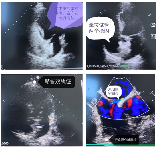 病例介绍:患者男,55岁,反复偏头痛10年,时常发生头晕。住院诊疗期间,排除脑病引起的头痛、头晕。后经右心声学造影发现大量右向左分流(>100个微泡),经食道心脏彩超检查见长遂道型卵圆孔未闭,遂道长度16mm、宽度1.8mm,伴薄弱房间隔约15mm。经心血管病科、脑病科及超声科专业人员会诊后,结合病人及其家属的意见决定行介入封堵术以预防反常栓塞。在手术开始前,心血管病科介入人员与超声人员仔细研究了患者的病情,共同制定了详细的手术方案。手术中参与人员密切配合,首先是明确导管的工作距离,超声在下腔静脉囗发现导管,并引导导管到达卵圆窝位置,用自制螺旋形加硬支撑钢丝(增加超声可见机率)配合导管,经未闭卵圆孔使导管达左房,并达肺静脉口附近,选用9F输送鞘送达左房,选用3030mm的卵圆孔未闭封堵器于左房内释放左房伞,后退全套装置使左房伞紧贴房间隔,再释放右房伞,牵拉试验见两伞符合要求,行发泡试验见无右向左分流,伞完全释放后重复超声检查,完全达到要求。整个微创手术仅用时40分钟就顺利结束。