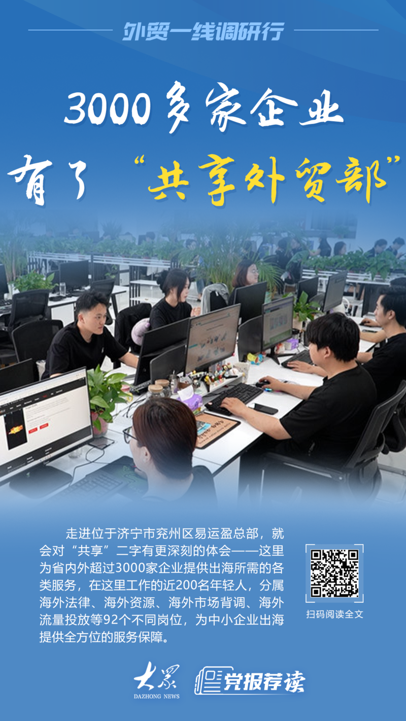 走进位于济宁市兖州区的易运盈总部,就会对“共享”二字有更深刻的体会——这里为省内外超过3000家企业提供出海所需的各类服务,在这里工作的近200名年轻人,分属海外法律、海外资源、海外市场背调、海外流量投放等92个不同岗位,为中小企业出海提供全方位的服务保障。