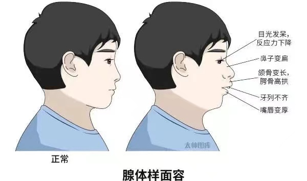3.全身症状:睡眠打鼾、缺氧(注意力不集中、龅牙/腺样体面容、影响生长发育、阻塞性睡眠呼吸暂停等)。