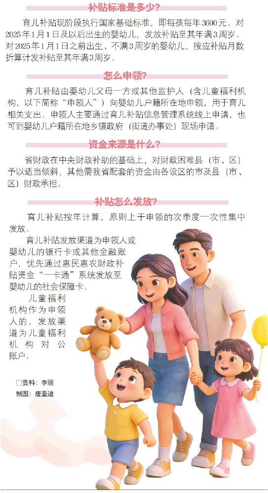 细则明确,育儿补贴现阶段执行国家基础标准,即每孩每年3600元。对2025年1月1日及以后出生的婴幼儿,发放补贴至其年满3周岁。对2025年1月1日之前出生、不满3周岁的婴幼儿,按应补贴月数折算计发补贴至其年满3周岁。
