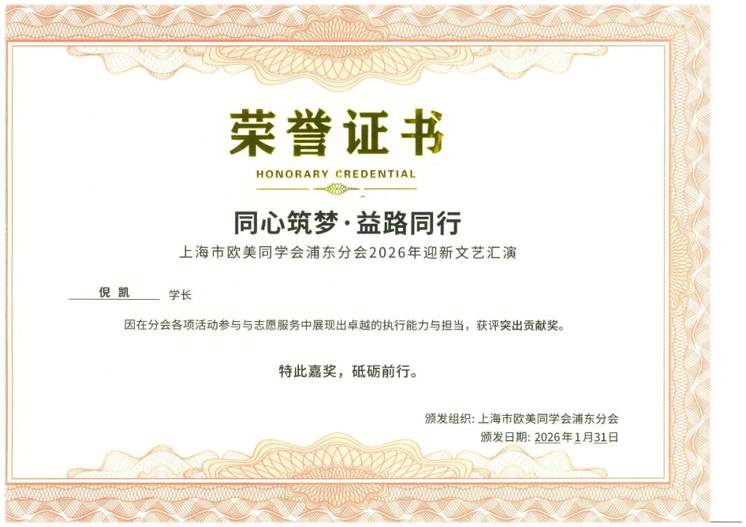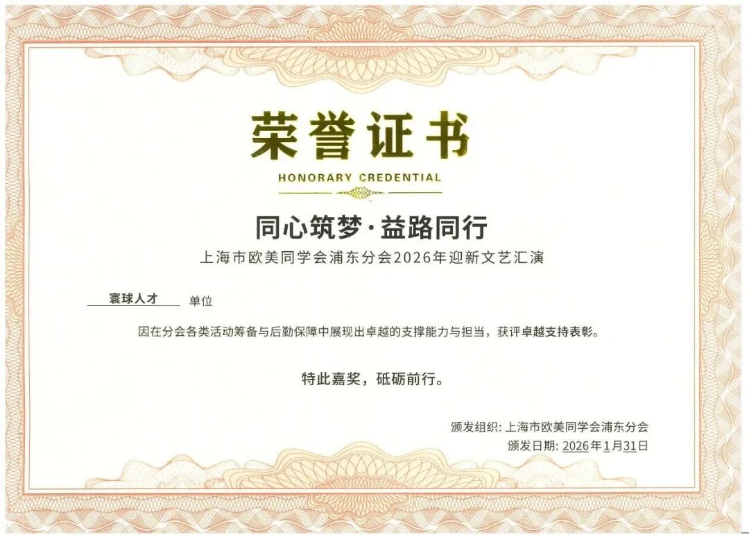 鲁网2月5日讯 1月31日,在上海市欧美同学会浦东分会举行的“同心筑梦·益路同行”2026年迎新活动中,寰球人才交流中心及其主任倪凯凭借过去一年中的卓越表现,分别荣获“卓越支持表彰”和“突出贡献奖”两项重要表彰。