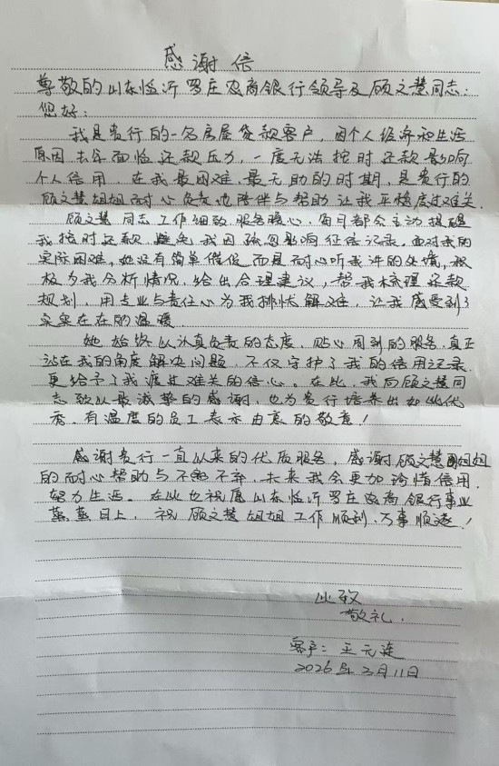 “那段时间我特别着急,多亏顾经理一直陪着我想办法,让我重新看到了希望。”王女士在信中动情地写道。如今,王女士已恢复正常的还款节奏,个人生活也重回正轨。
