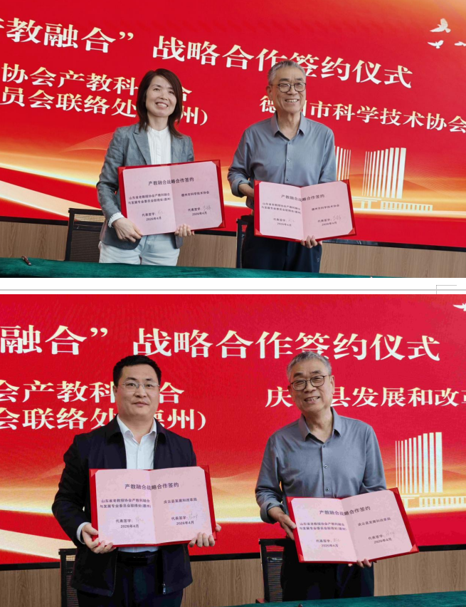 活动现场同步举行战略合作签约仪式。山东省老教授协会产教科融合与发展专业委员会联络处(德州)分别与德州市科学技术协会、庆云县发展和改革局、天衢新区宋官屯街道签订“产教融合”战略合作协议,进一步拓展校地合作广度与深度,凝聚多方资源,共促区域高质量发展。