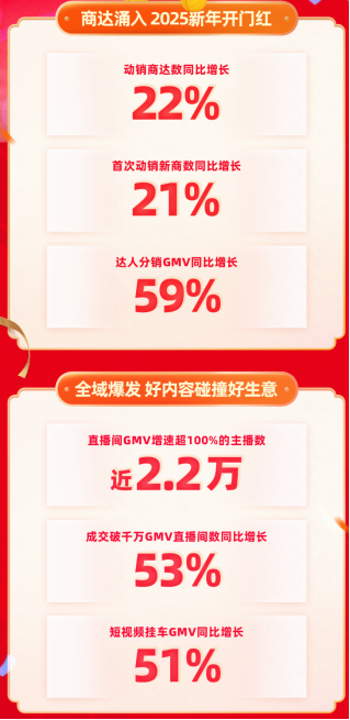 1月14日,快手电商发布2025快手年货节战报。战报数据显示,年货节期间,动销商达数同比增长22%,首次动销新商数同比增长21%,达人分销GMV同比增长59%。