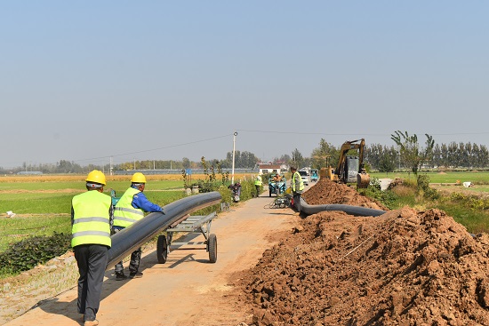 11月1日,在郯城县杨集镇周楼村南,施工人员铺设农村安全饮水工程管道。