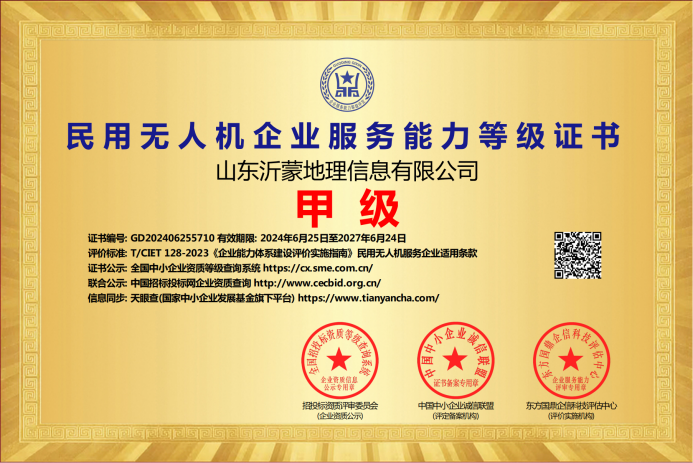 山东沂蒙地理信息有限公司取得乡村振兴服务企业能力和民用无人机企业服务能力甲级证书