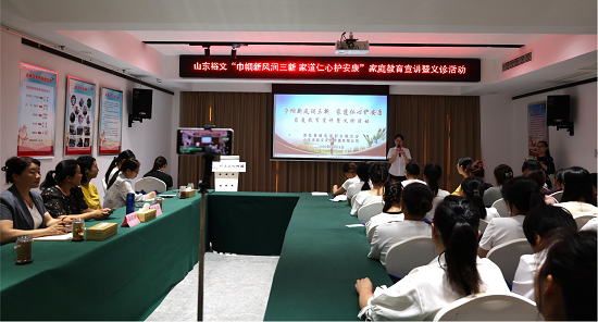 在山东裕文文化传播有限公司的会议室里,一场别开生面的家庭教育宣讲正在进行,公司55名女员工们齐聚一堂,认真聆听着费县家庭教育和心理健康志愿者王友玲以《父母的语言》为题的精彩讲座。