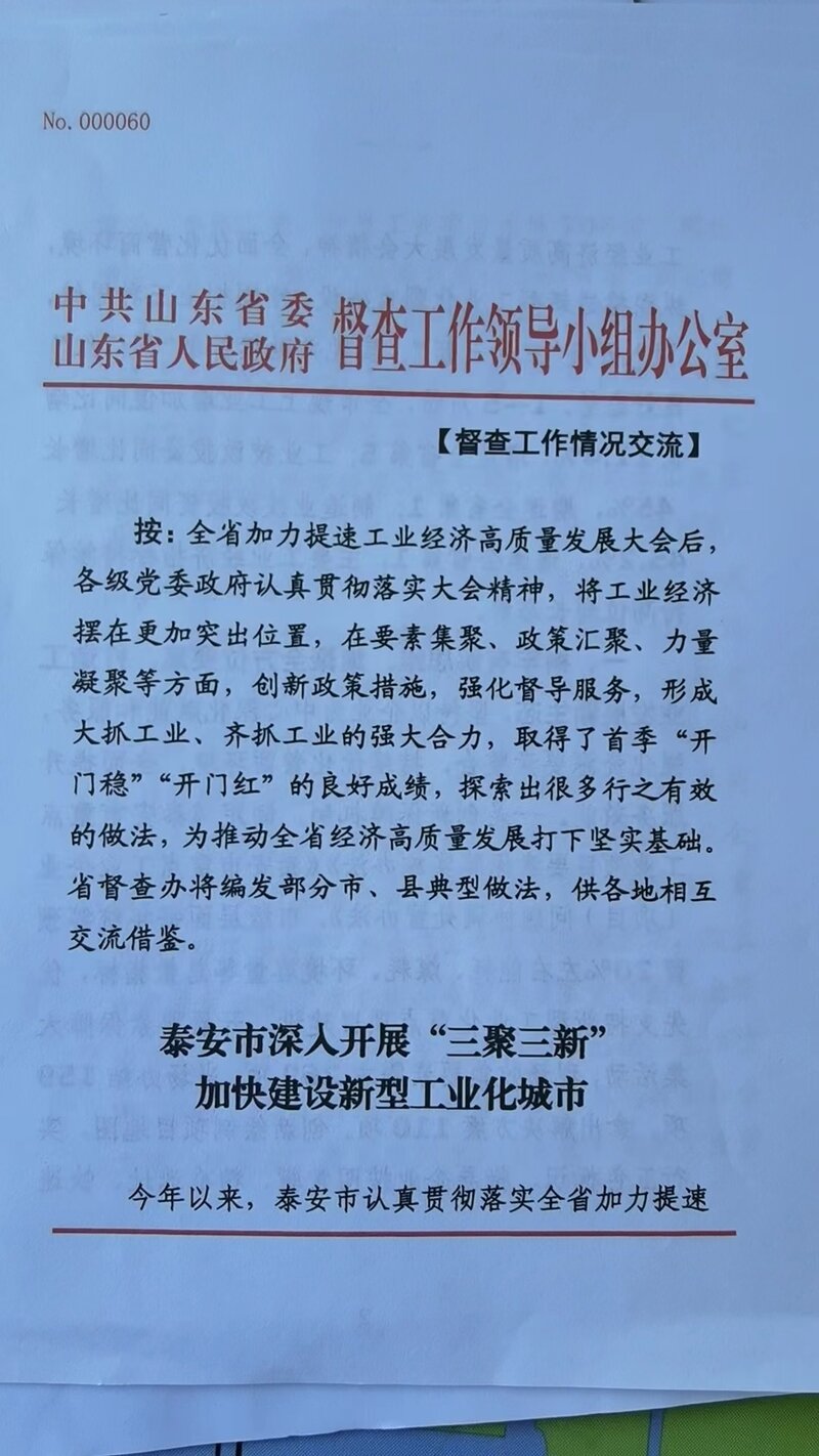 三、树牢平台思维,凝聚全领域力量,探索协同发展新路径。搭建比武、会客、联盟、督查四个平台,制定全市制造业协同发展实施方案,着力打造协同互补、跨界融合、高效联动的协同发展路径,为新型工业化建设凝聚强大力量。一是搭建“五大比拼、两大问效”擂台。建立新型工业化项目策划、签约、开工、要素保障、集中观摩“五大比拼”以及链长问效和市委、市政府主要负责同志一线问效“两大问效”推进机制。每季度组织一次项目策划大比拼、一次项目开工大比拼,每季度优选确定1个县市区(功能区)作为主会场组织集中开工,每半年进行重点项目实地观摩评议活动,每月对市直有关部门单位要素保障情况进行调度排名。累计集中开工新型工业化项目524个,总投资2336.07亿元,已有91个项目竣工投产,其中,赫里欧光伏建筑一体化一期、国泰大成新材料科技产业园、吉利远程本途新能源商用车等一批重大项目竣工投产。二是高水平建设泰山产业会客厅。统筹整合数据资源,打造并上线泰山产业会客厅。泰安概况、工作动态、“泰好客”招商平台、“泰企通”服务平台、“泰好品”供需平台等五个板块已上线,产业大脑和泰山智造科创平台正在规划建设;已入驻企业1068家,完成信息维护526家。“泰好客”招商平台版块已重点推荐策划项目306个。三是建好用好“1+13”联盟(协会)。充分发挥商(协)会桥梁纽带作用,组建“1个制造业联盟(协会)+13个产业链行业商(协)会”的商(协)会体系,内设市制造业创新联盟、数字转型服务商联盟,每个产业链组建科技创新专业委员会,加强技术难题联合攻关,搭建政企之间、企业之间、校企之间合作交流平台,全面助力政产学研金服用融合发展。四是发挥企业诉求督办平台作用。把解决好企业、群众急难愁盼问题作为今年督查工作重点,对企业诉求“接诉即办”平台、“12345”政务服务便民热线、“互联网+督查”、人大代表、政协委员、媒体等渠道反映的问题线索重点督办,构建全链条闭环式督办机制,助力打造一流营商环境,更好服务高质量发展。(通讯员 高传庆 郝 飞)