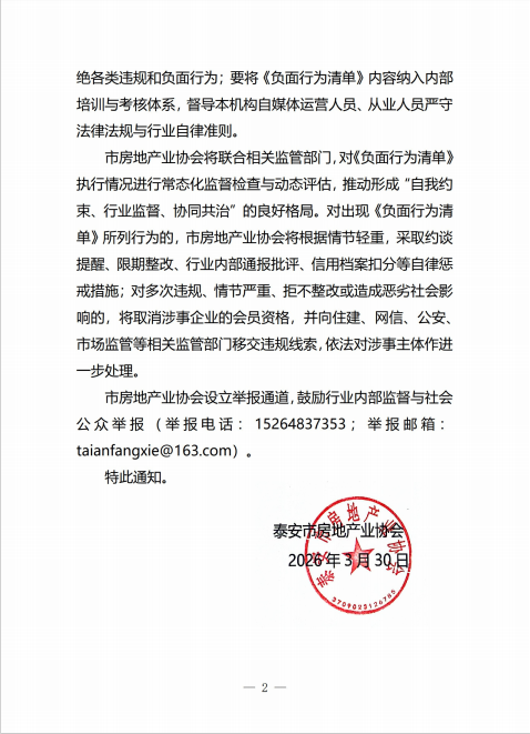 鲁网4月9日讯 为深入贯彻国家、省、市关于规范房地产市场秩序工作部署,切实净化房地产网络信息生态,防范虚假宣传、违规引流、恶意炒作等突出问题,维护购房群众合法权益与市场平稳健康发展,泰安市住房和城乡建设局、泰安市房产管理服务中心指导泰安市房地产业协会印发《泰安市房地产自媒体负面行为清单》,以“监管+自律”协同发力,全面规范房地产自媒体信息发布行为。