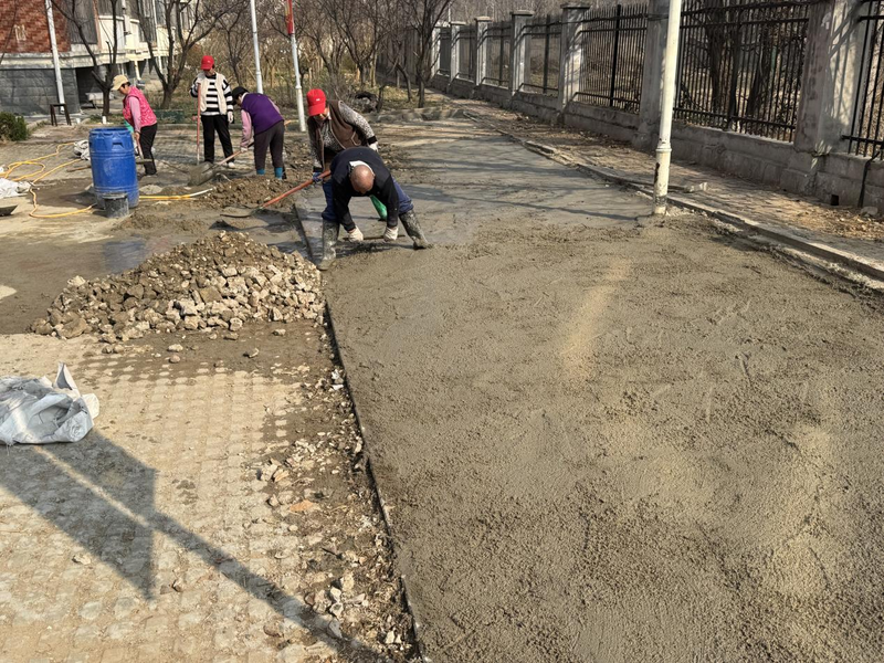 针对这一问题,社区党委迅速响应,联合物业公司进行实地勘查,共同商讨制定修缮方案,双方决定采取“彻底清理、硬化铺平”的方案,先组织人员将原有的松动石块全部砸掉并清理干净,随后进行水泥浇筑硬化。施工过程中,社区与物业密切配合,尽量减少施工对居民出行的影响,确保施工安全与效率并重。经过紧张有序的作业,原本坑洼破损的地面焕然一新。