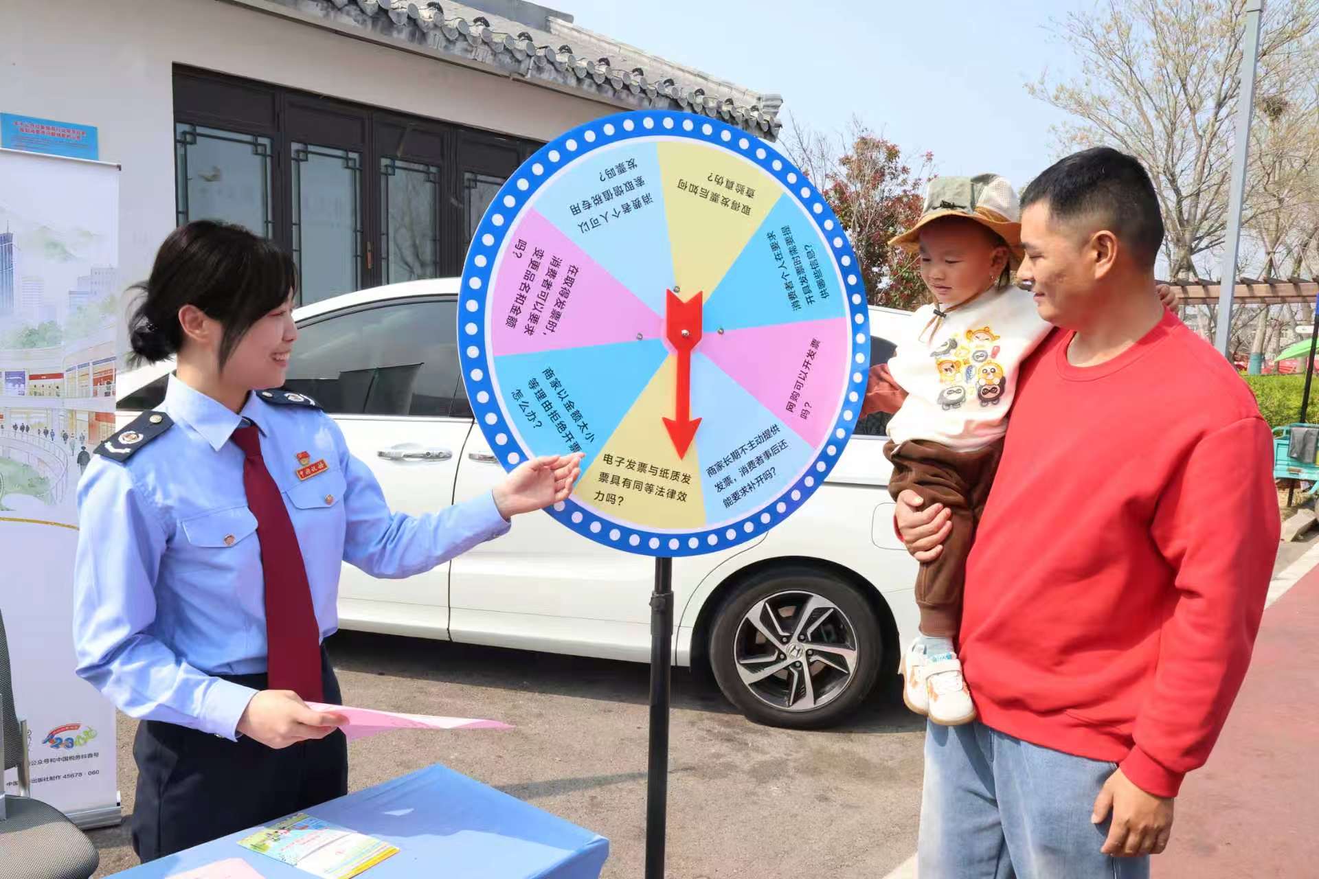 税法知识大转盘互动游戏吸引了众多游客驻足参与。为了让税收普法宣传更接地气、更具趣味性,税务干部们将抽象的税法条款转化为生动有趣的问答题目,涵盖合规开票、纳税信用、税费优惠等与群众工作生活息息相关的内容,让游客在轻松愉快的氛围中了解税法知识。一位带着孩子来赏花的游客表示:“带孩子转转盘学税法,他玩得开心,我也跟着学到了不少实用知识。”