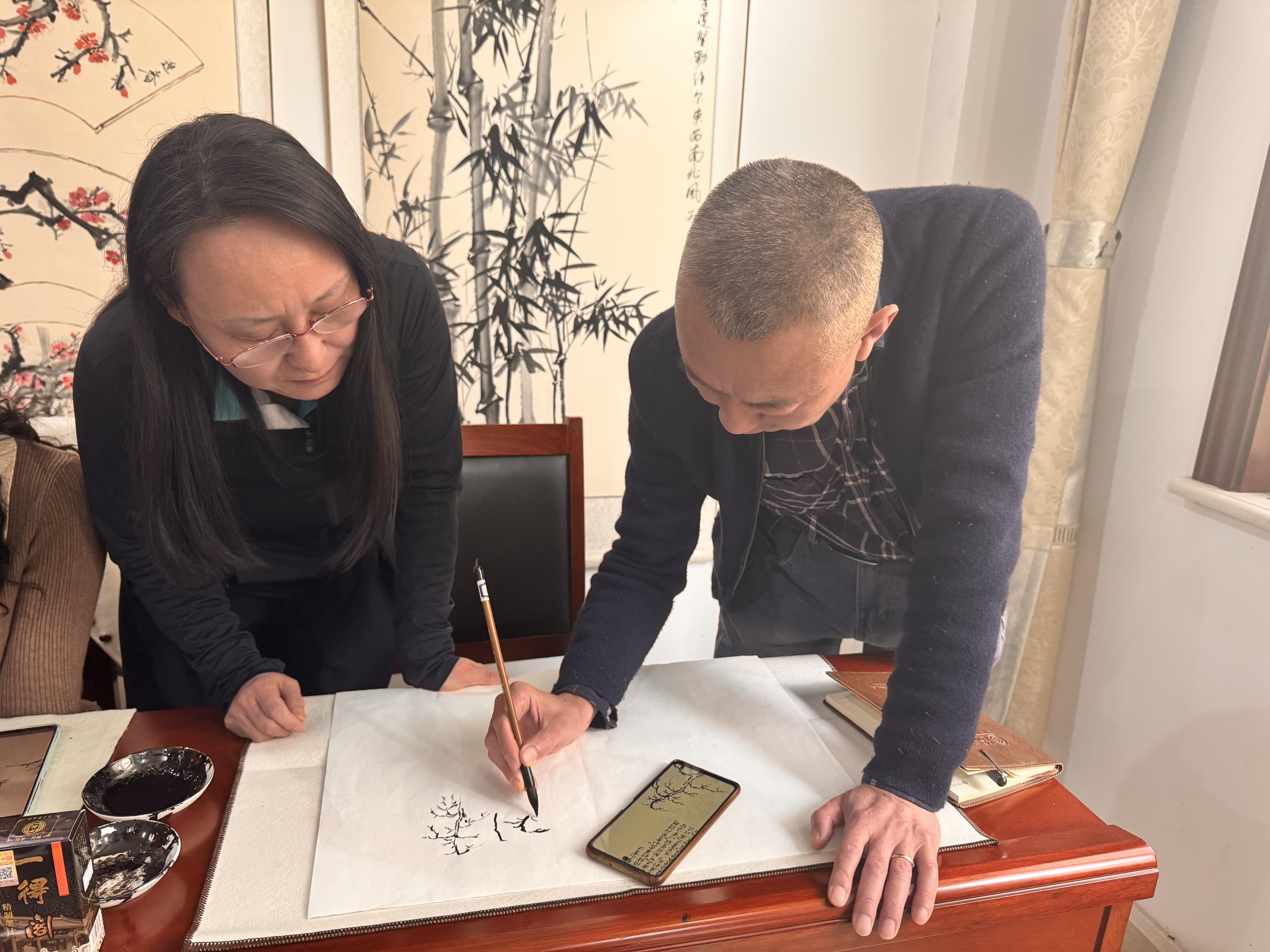 参与课堂的居民们兴致盎然,个个精神饱满、全神贯注,纷纷拿起毛笔,蘸墨、落笔、勾勒、渲染,在宣纸上认真尝试创作。大家沉浸在墨香与笔尖的交融之中,时而低头仔细描摹,时而相互交流探讨绘画心得,现场墨香四溢、氛围融洽,处处洋溢着浓厚的艺术气息。不少居民表示,平日里忙于工作和生活,很少有机会接触国画艺术,社区开设这样的公益课堂,不仅让大家学到了专业的绘画技能,更在笔墨丹青中舒缓了身心、陶冶了情操,极大地丰富了业余文化生活。