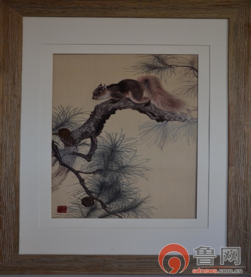 《松鼠图》鲁绣,作者:李银凤,绣时4个月,根据画家王申勇作品再次创作绣制,主要运用施毛针、接针、散套针、松针、旋针、虚针、乱针、放射针、滚针等十多种针法绣制而成。荣获2017——2018年度山东省工艺美术精品奖。2018年中国工艺美术青艺杯铜奖。作品可定制。定制价格18.8万元。