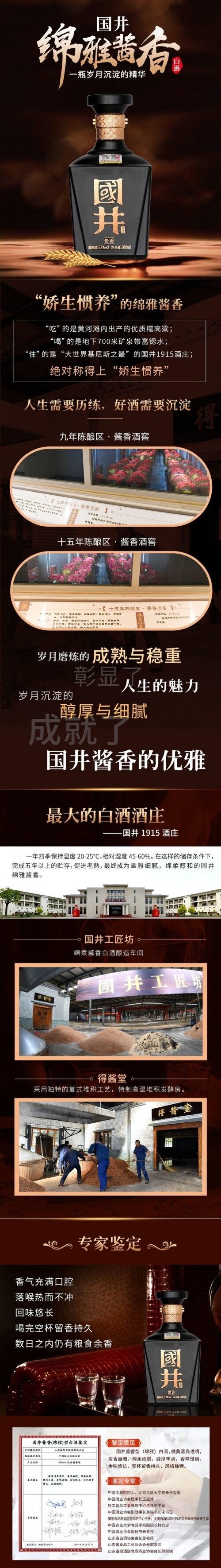 企业生产的国井酱香型(绵雅)白酒,通过定向培养功能性菌种,形成绵柔、醇和、幽雅的酱香新风味,使产品更健康、更舒适,开创了白酒绵雅酱香风味的先河。此款白酒微黄清亮透明,酱香幽雅,绵柔细腻,醇厚丰满,香味谐调,余味悠长,空杯留香持久,风格独特。