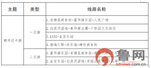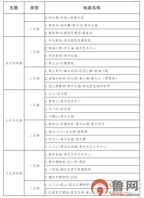 潍坊市文化和旅游局从旅游、文化、教育等不同角度推出了健康养生、研学修习、踏青赏花、乡村民俗、亲子采摘、山水风光、文化体验和都市打卡8个系列一日游、二日游共52条潍坊精品旅游线路。例如踏青赏花可到青州花好月圆景区、安丘齐鲁酒地、昌邑潍水田园综合体、寿光中华牡丹园、滨海方青玫瑰园等,可让您在花的海洋中徜徉;山水风光可到青州泰和山、青州云门山、青州仰天山、临朐嵩山、临朐石门坊等,可以让市民、游客畅游大自然,在天然氧吧里尽情呼吸;文化体验可到潍坊市博物馆、潍坊市世界风筝博物馆、青州博物馆、奎文1532产业园、诸城常山文博苑等,让市民、游客更好的了解潍坊的历史文化、风筝文化、名人文化等;亲子采摘可到坊子玉泉洼莫沙夫田园综合体、坊子水墨庄园、安丘小麦屿村、安丘落鸦石村、昌乐庵上湖村、高密五龙河农场等,可以在出游过程中更好的增进父母与子女之间的感情。