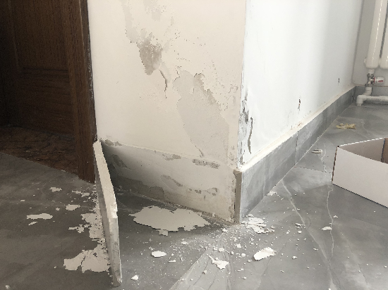 业主齐先生表示,2018年10月份开始装修,在装修时卫生间试水48小时就出现墙面渗水现象,业主齐先生向物业反映,物业告诉他用堵漏凝在过门砖处做一下防水措施。时隔三个月后业主齐先生发现堵漏凝并没有起到很好的防水作用,墙面渗水情况更为严重。装修期间,并没有使用卫生间大规模用水,业主齐先生怀疑是施工方没有做好防水措施。记者在现场用手轻微触碰渗水处墙皮,墙皮连续脱落。