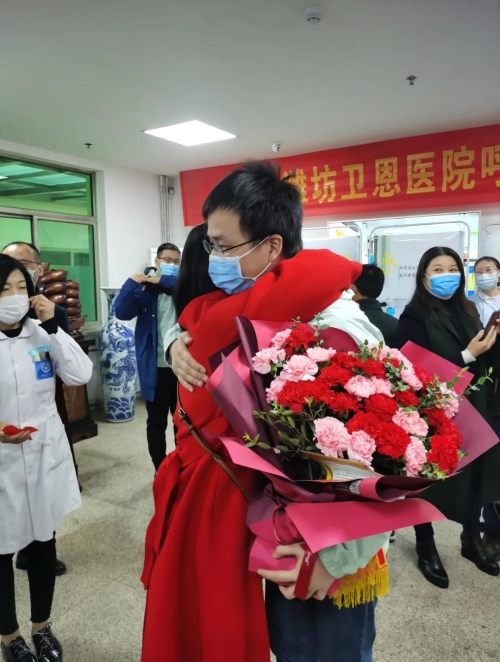 4月9日,春雨菲菲,给大地带来甘霖。当天,潍坊卫恩医院援鄂医疗队5名医护人员魏春华、邱斌、修彩丽、林恬、韩明结束了14天的隔离休整,一起回到医院,同事和市民都冒雨来迎接。