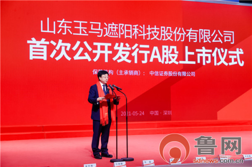 鲁网5月24日讯 5月24日,山东玉马遮阳科技股份有限公司首次公开发行A股上市仪式在深圳市举行,标志着玉马遮阳在深圳证券交易所创业板正式挂牌上市。潍坊及寿光市领导刘运、李鹏、周岩参加。