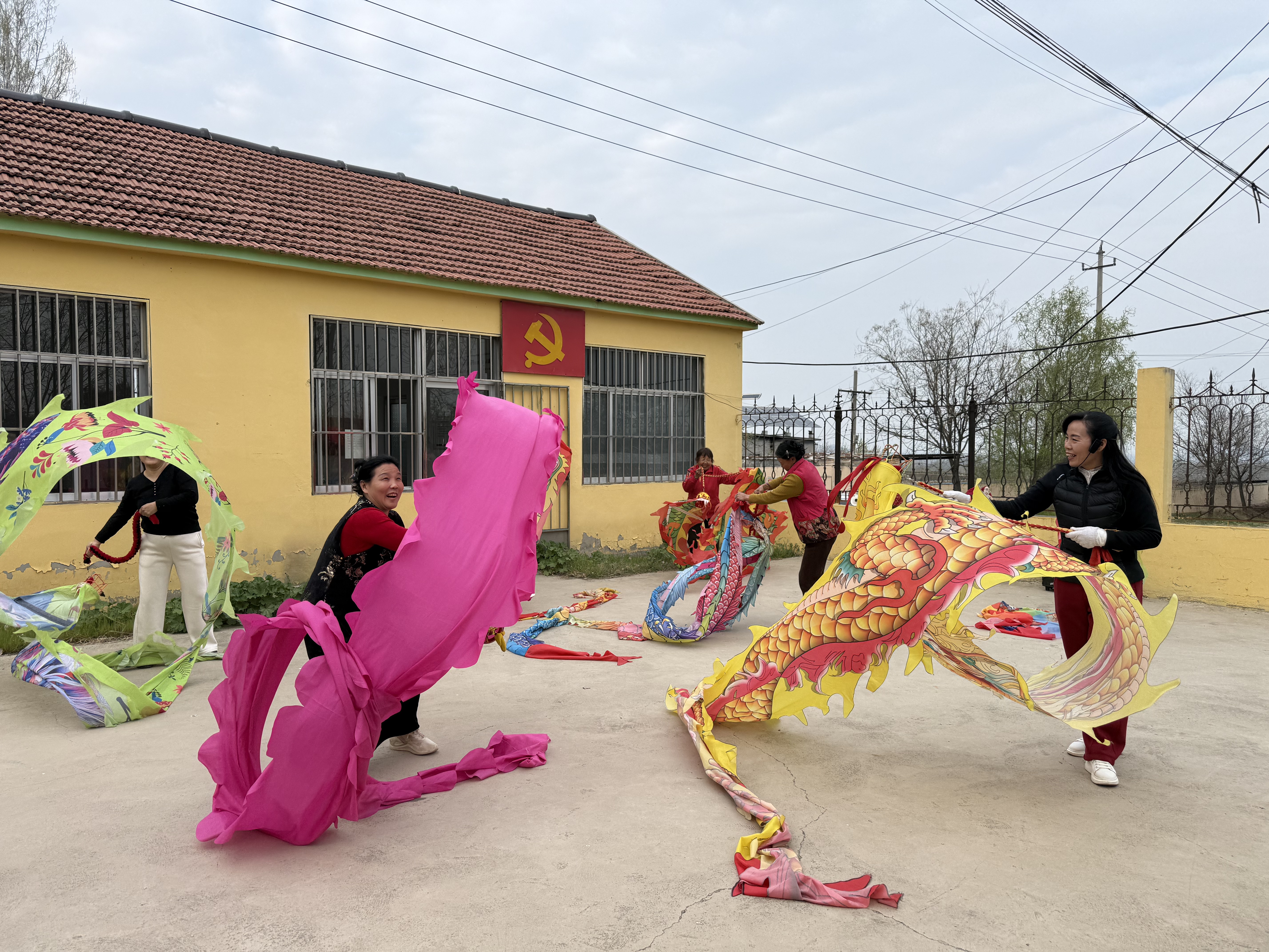 还没进村,就听见“咚咚”的鼓点声从村委大院传出,像春雷滚过田野,带着泥土的劲儿。院里早已围满了人,刘肖英手持鼓槌,正手把手地教队员们调整节奏。她告诉大家,传统大鼓不能丢,但更要“活”起来——于是,鼓阵旁,舞龙翻飞,彩扇翩翩,秧歌步里和着鼓点,原本单一的大鼓一下子热闹了起来。村民们看得眼睛发亮,脚下也忍不住跟着节拍动起来。