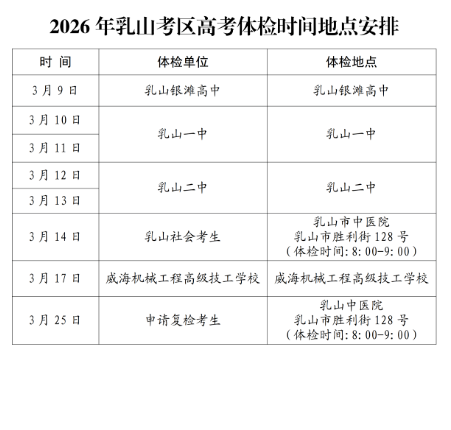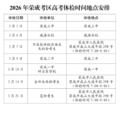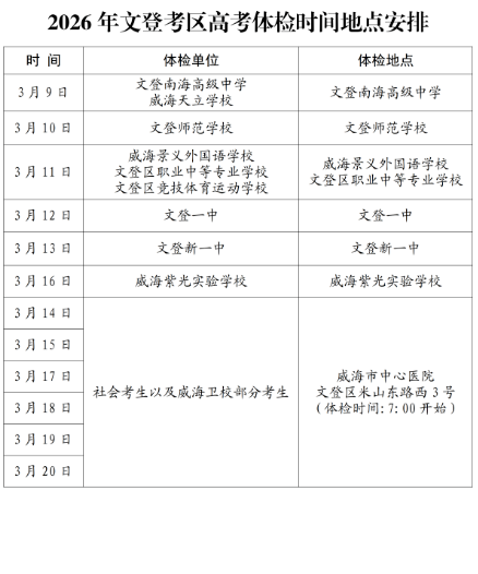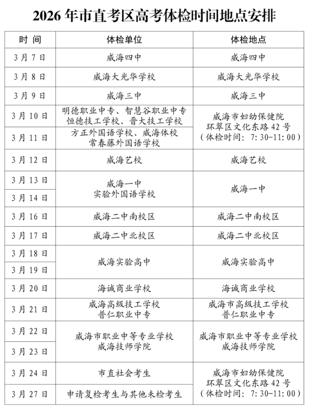 鲁网3月6日讯 普通高校招生体检是普通高校招生工作的重要组成部分,是对考生身体素质进行综合评估和检查,关系到每一位考生的切身利益。根据山东省教育招生考试院统一安排部署,威海市高考体检工作将于3月5日至31日进行,具体体检时间由各区市自行确定,相关工作安排如下: