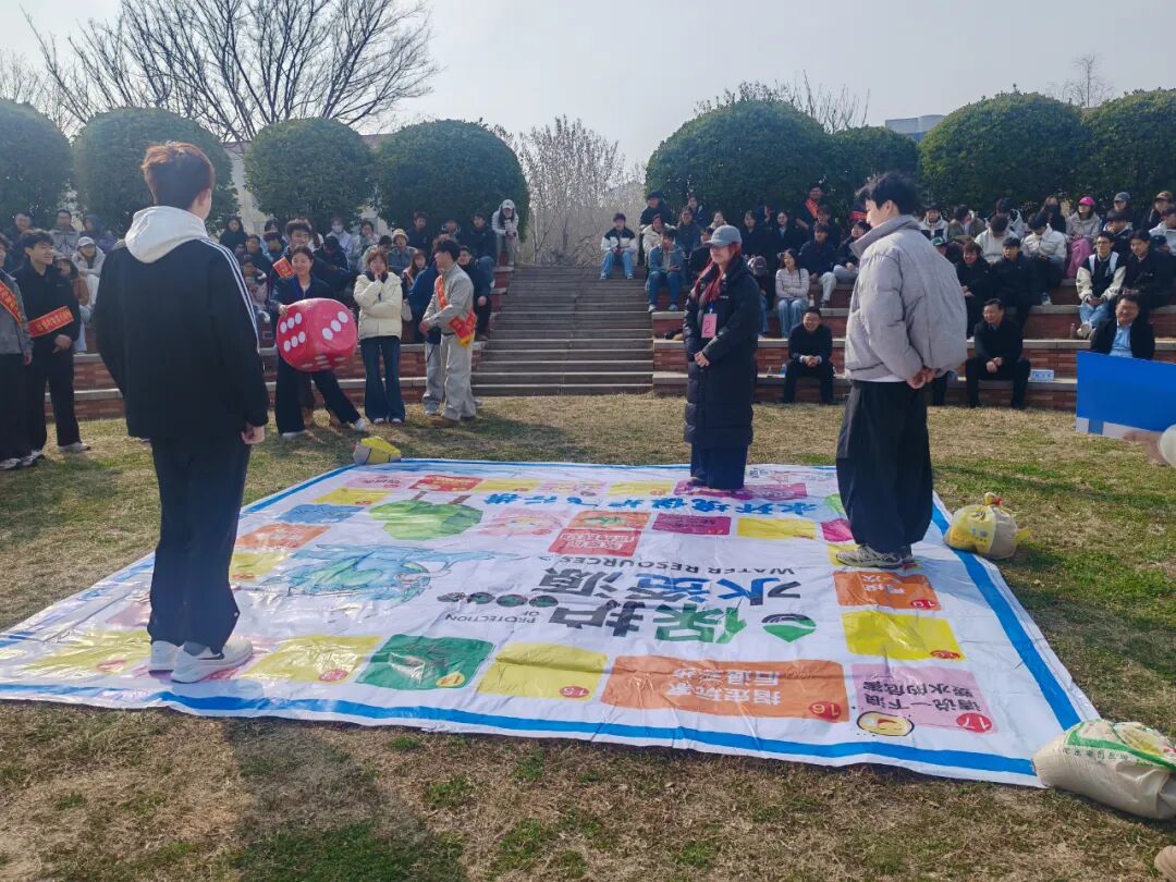 活动现场暖意融融、热闹非凡,一场别开生面的节水主题宣传活动在此拉开帷幕。本次活动创新推出“节水大富翁”互动游戏,将节水知识、水情常识、法律法规融入趣味棋盘之中。巨大的彩色游戏垫铺展在草坪上,巨型充气骰子、趣味沙包道具吸引了众多师生驻足参与。参与者们通过掷骰子、走格子,在“闯关答题”中学习节水小技巧,在互动比拼中了解我国水资源现状,在欢声笑语中掌握《中华人民共和国水法》《节约用水管理条例》等相关知识。