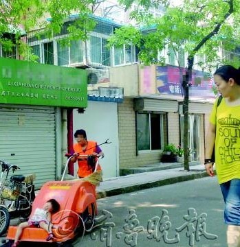 9日下午4时,在和平路一所小学附近,一位环卫工正用扫帚清扫着大街,在她的背上,还背着一个小孩,挠着小脚,看到对面过来的大车,“咿咿呀呀”地叫着。