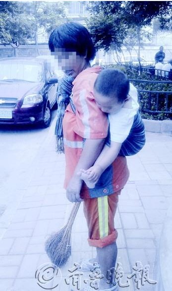 没人照顾上幼儿园年龄又不够 环卫工无奈背孩子扫街