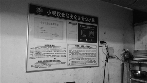 从今年上半年开始,这里鳞次栉比的小餐饮店开始迎来有关部门的检查,一位店老板说,食药监、卫生等部门的工作人员都来了,说要求每家店都要挂牌,办理备案证明。“他们先给我们挂的公示牌,然后收费,给了我们一个收据。”