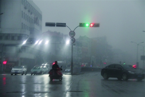 昨日,省城市民在雾雨中前行。当日,济南遭受雾霾与降雨降温天气 记者郑涛摄