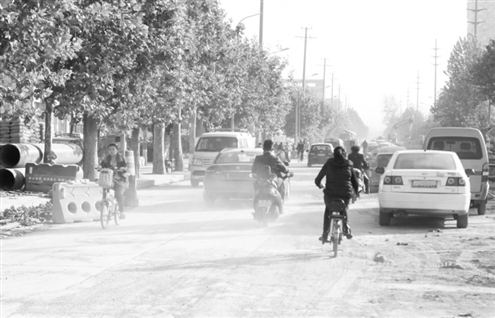 化纤厂路道路施工,车辆经过扬尘漫天 记者赵天羿摄