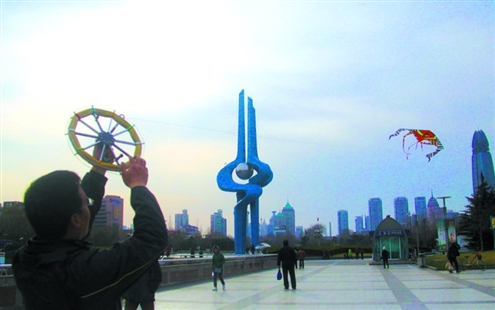 昨日,省城蓝天白云,泉城广场上聚集了不少放风筝爱好者,他们趁着“春”风放飞纸鸢 记者赵天羿摄